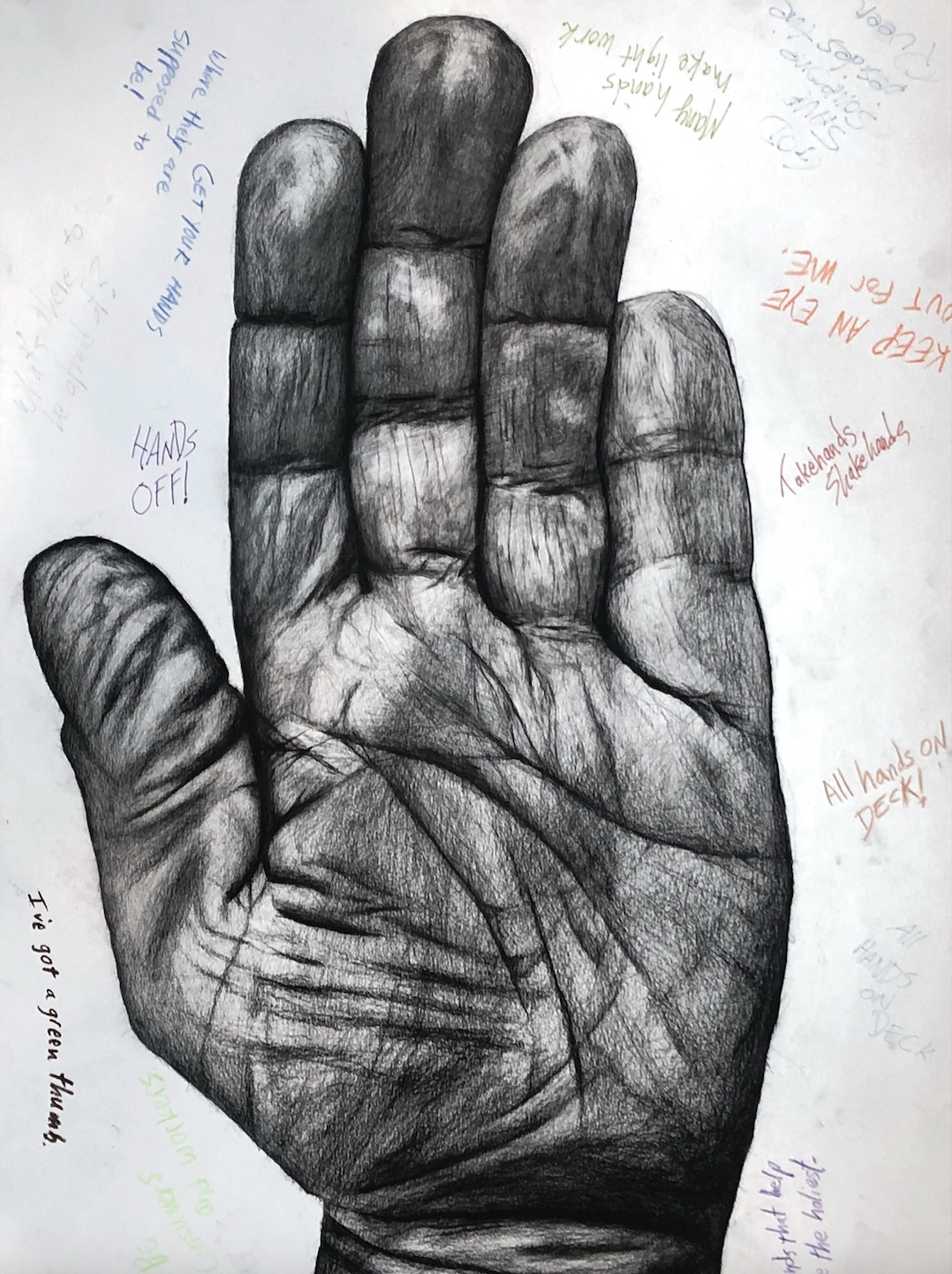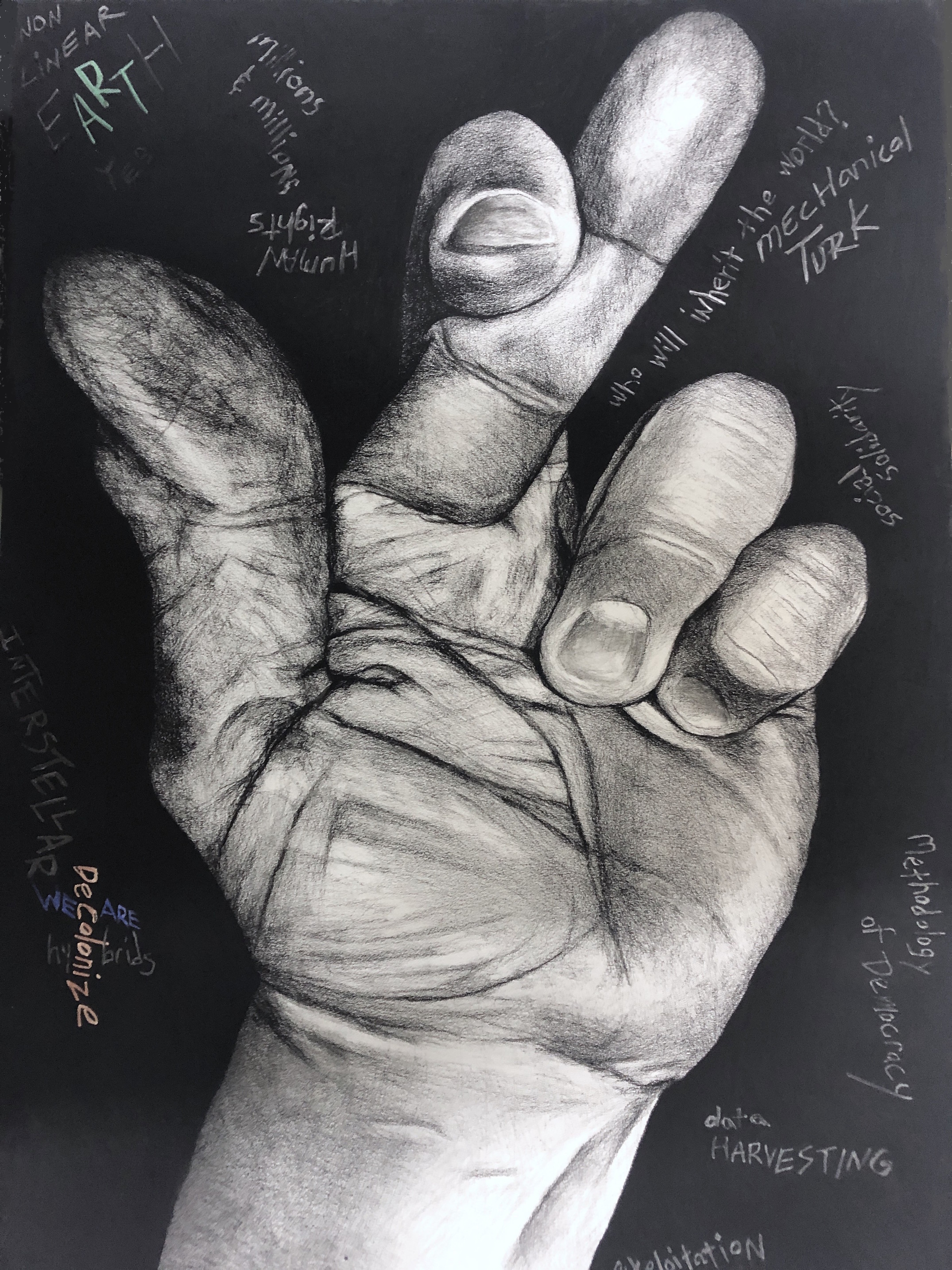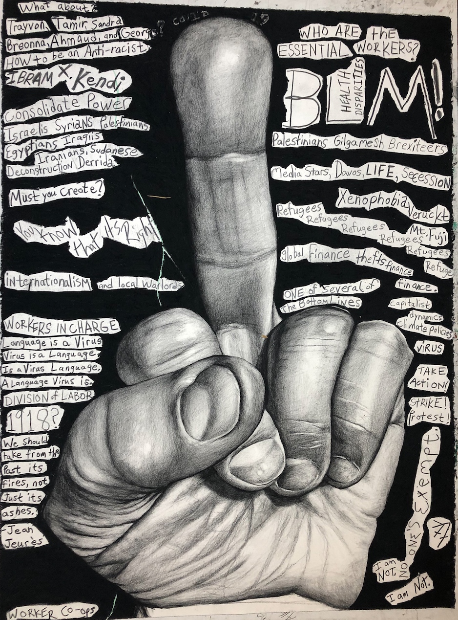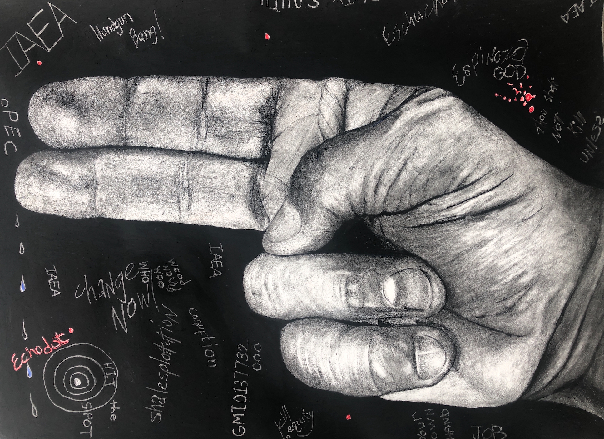 was developed between 2019 and 2022, three years when these images had especially potent meaning, some more than others. The drawings are made from photographs and are meant to look like photographs because believing an image is a photograph changes one’s understanding of that image. Each drawing also includes “comments” in the area around the drawing of the hand. These comments are meant to be seen as the marginalized art of graffiti instead of the more recognized sphere of real art represented by drawings or the respected realm of academic publishing. The GIF that accompanies each drawing is made about the same emoji image, but demonstrates the multiple meanings of each image. Seen together, the GIFs and the drawings are meant to be equal parts of a work of art.