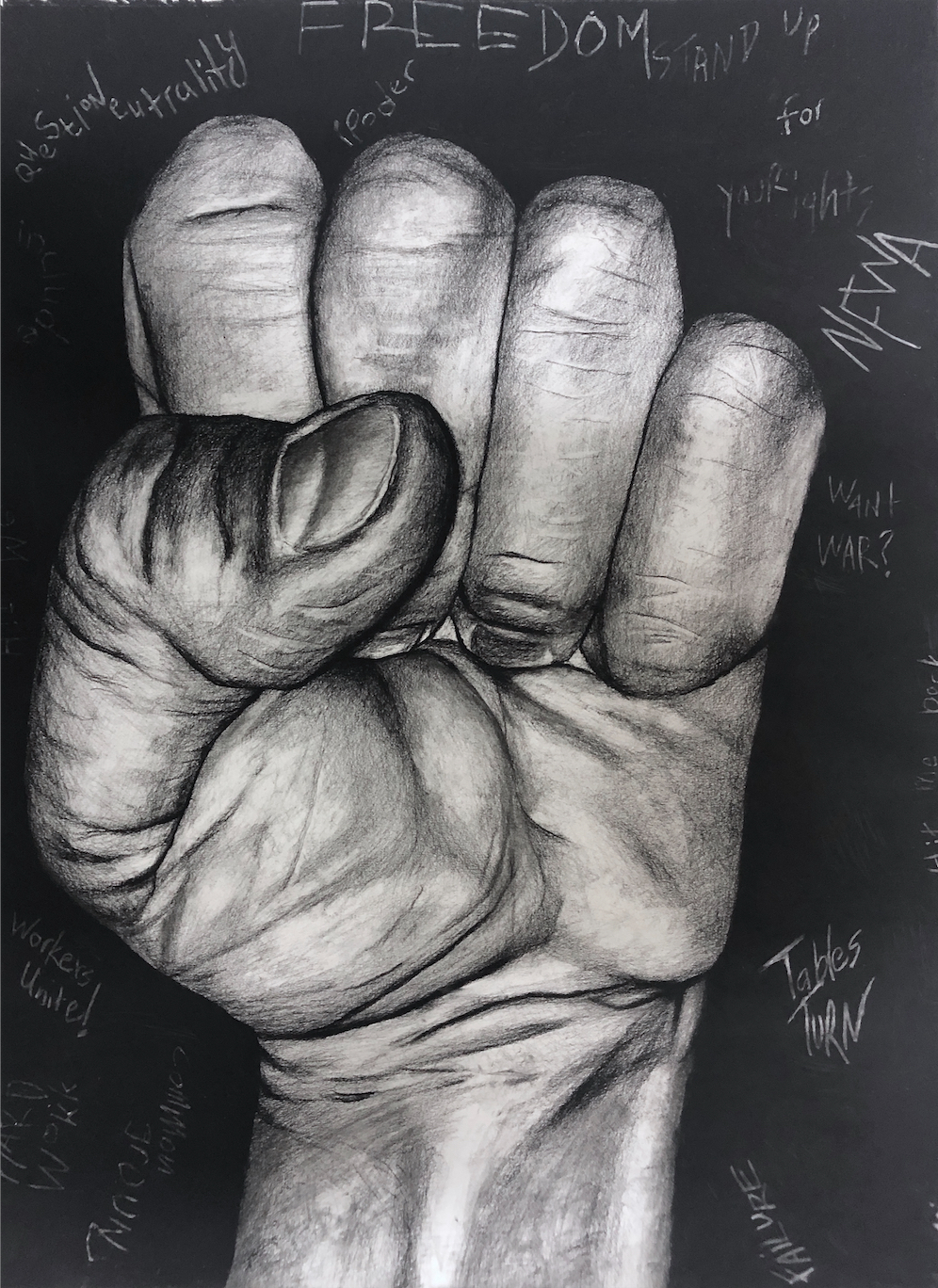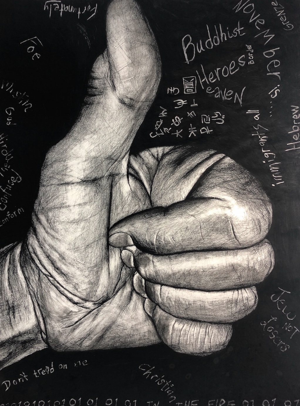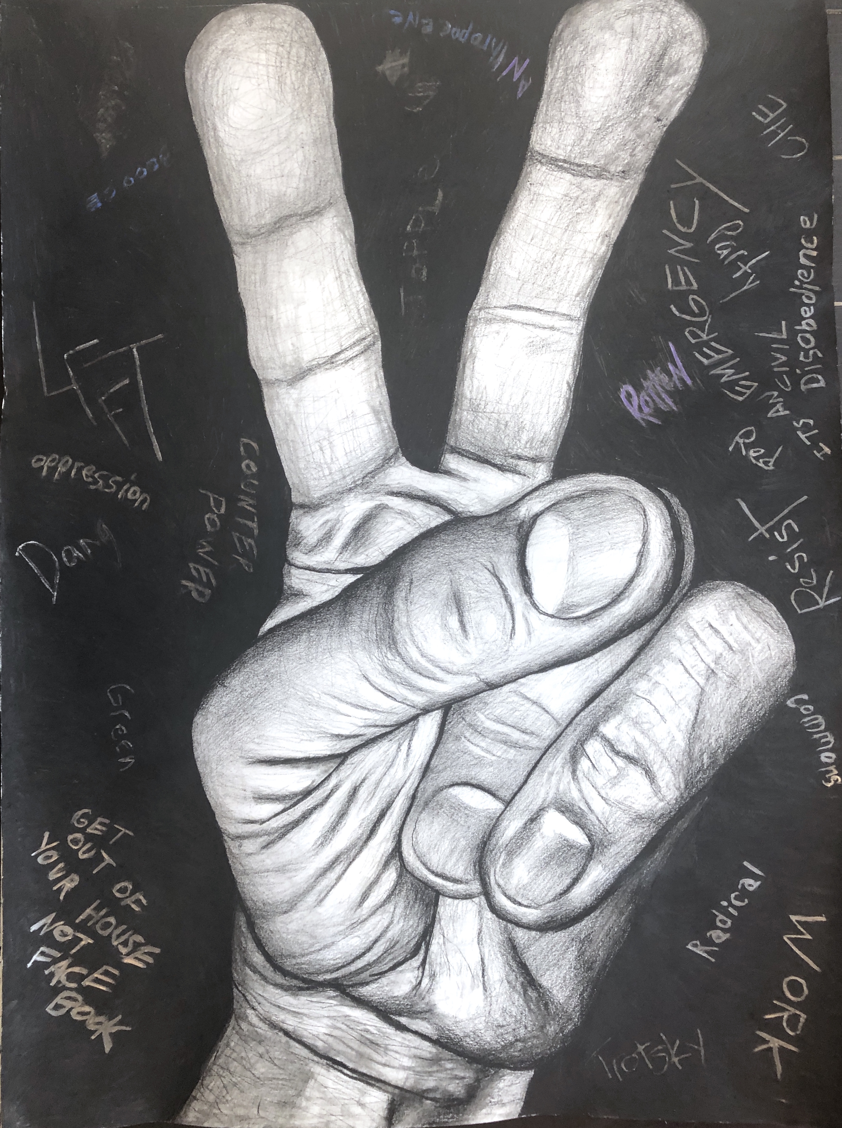 was developed between 2019 and 2022, three years when these images had especially potent meaning, some more than others. The drawings are made from photographs and are meant to look like photographs because believing an image is a photograph changes one’s understanding of that image. Each drawing also includes “comments” in the area around the drawing of the hand. These comments are meant to be seen as the marginalized art of graffiti instead of the more recognized sphere of real art represented by drawings or the respected realm of academic publishing. The GIF that accompanies each drawing is made about the same emoji image, but demonstrates the multiple meanings of each image. Seen together, the GIFs and the drawings are meant to be equal parts of a work of art.